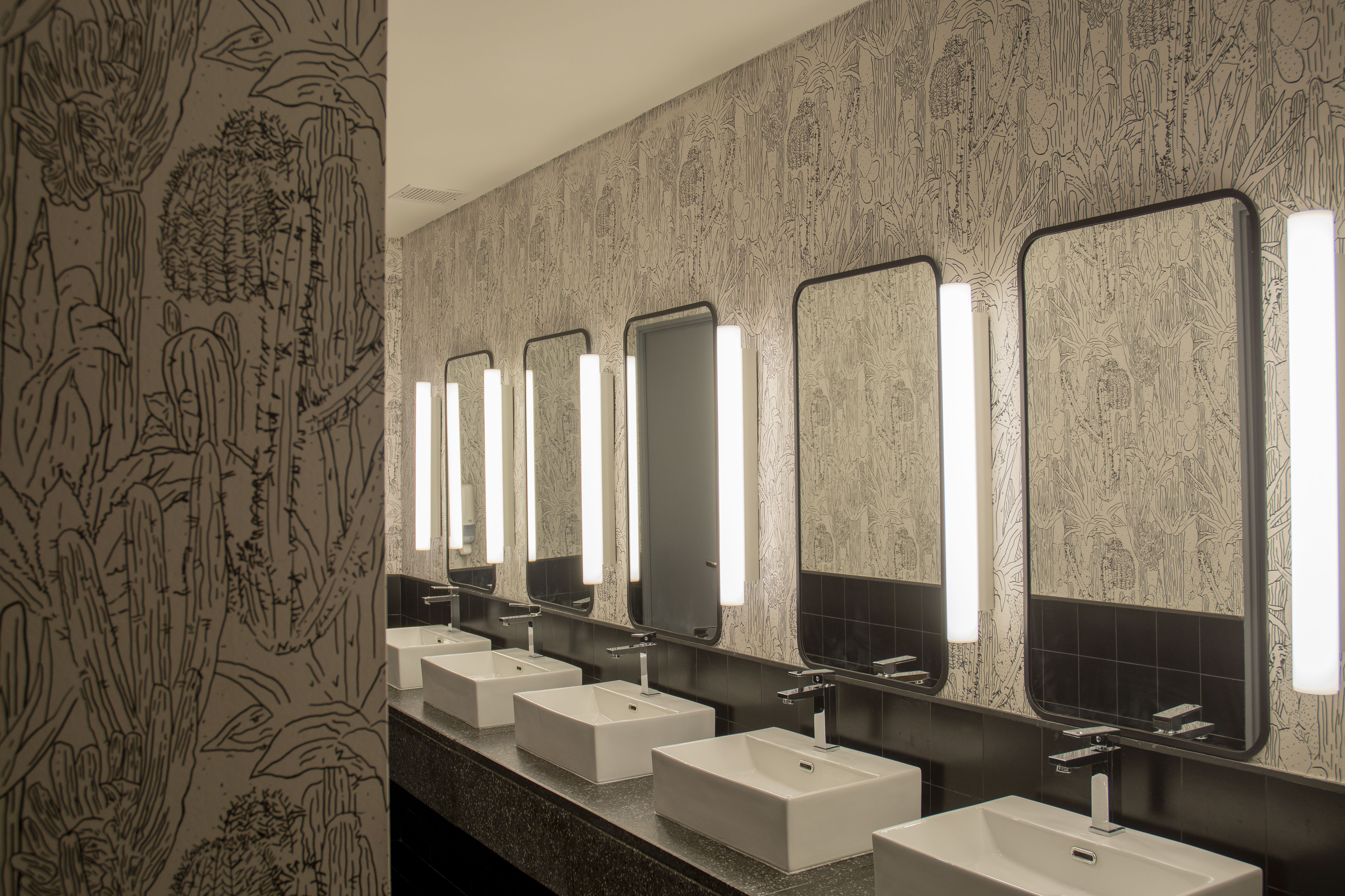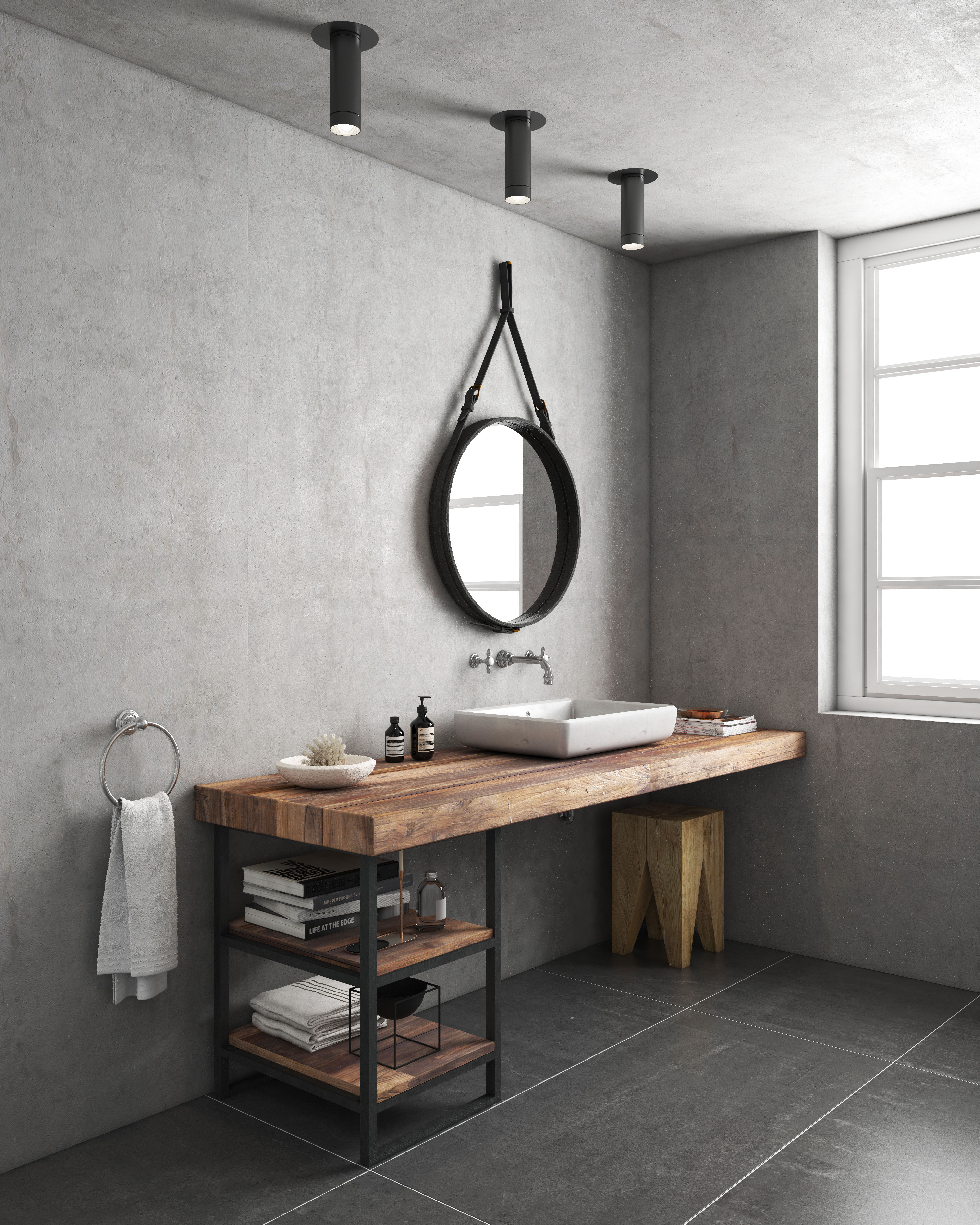 Debe tener luz clara pero cálida. Los plafones Charles o Cavia brindan luz general uniforme. Los apliques Puma o Tokio simétrico junto al espejo evitan sombras y reflejos, manteniendo un tono natural y agradable.